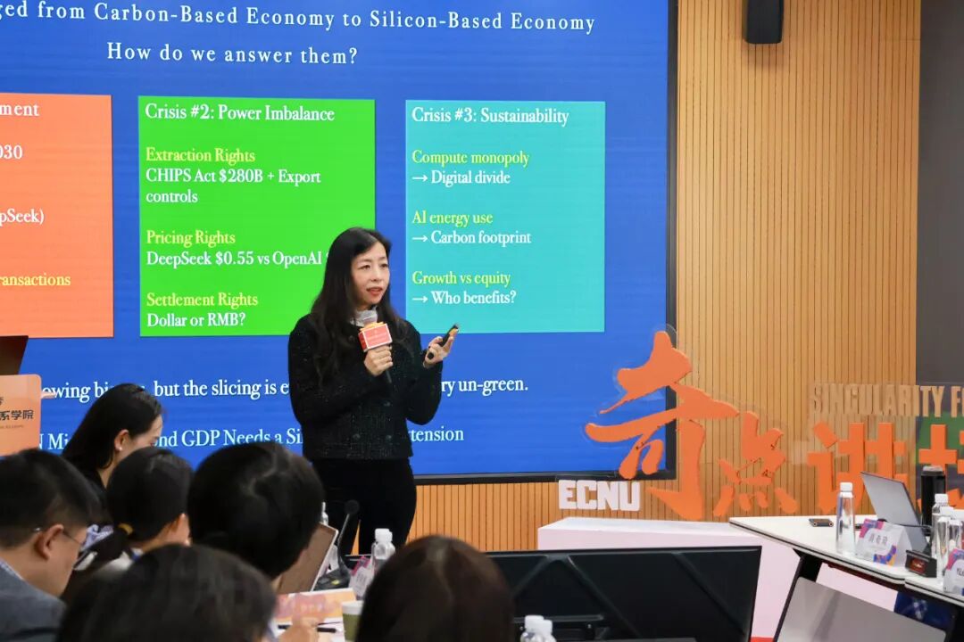 91在线 上海人工智能金融91在线 院长邵怡蕾教授在演讲中,以“地球OL:从金融风洞看社会系统的介观模拟”为题,将地球比作一个拥有80亿玩家的在线游戏,而当前系统正面临“过载”风险,亟待“维护”与“重构”。社会系统模拟应借鉴金融风洞的“介观”逻辑,重点设计和调控中间互动网络的目标与结构。关键在于,必须改变驱动系统的“计分板”。以增长为核心的传统GDP指标已不适用于人机共生的未来。她呼吁政策制定者和学者共同设计新的“游戏规则”,并介绍了其团队提出的“智能可持续国内生产总值新经济核算框架。该框架旨在将计算资源、算法、数据与智能体劳动等新型生产要素纳入度量,并将平等、韧性、可持续性等目标嵌入评估体系,以期通过重塑“计分板”来引导社会走向协调、可持续的发展路径。
